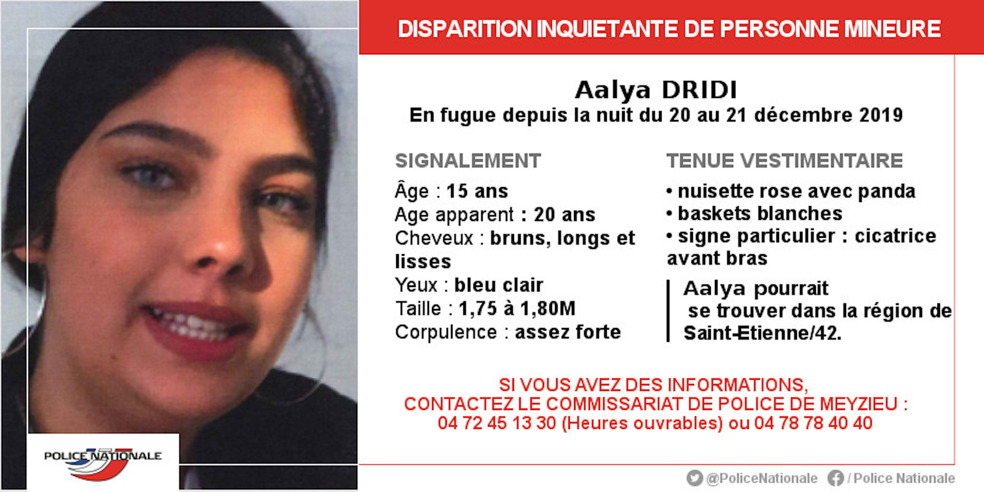 Toute personne étant susceptible d’avoir des informations sur la localisation d’Aaly sont invités à contacter le commissariat de police de Meyzieu au 04.72.45.13.30 en journée et l’hôtel de police de Lyon au 04.78.78.40.40 la nuit, le week-end et les jours fériés.